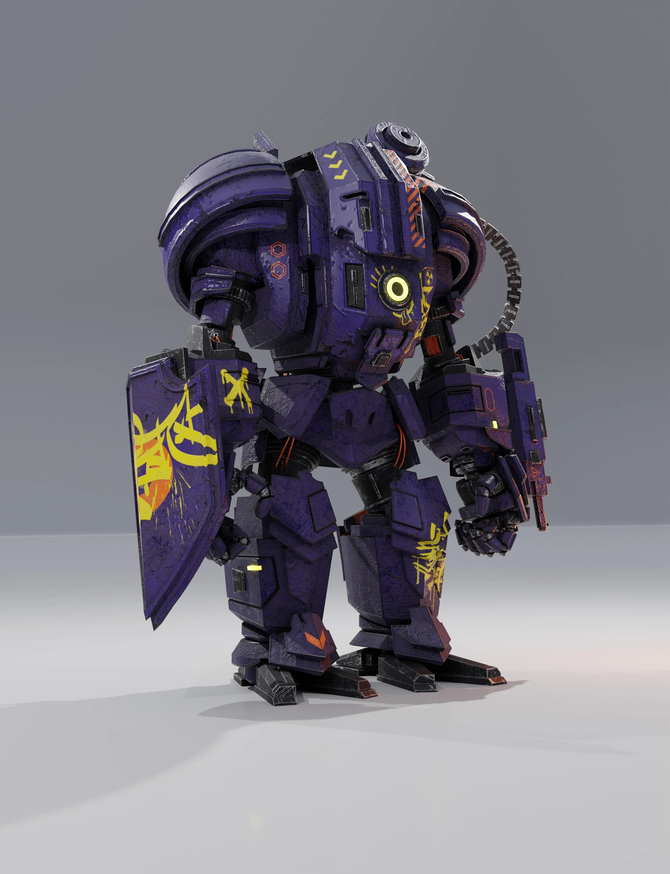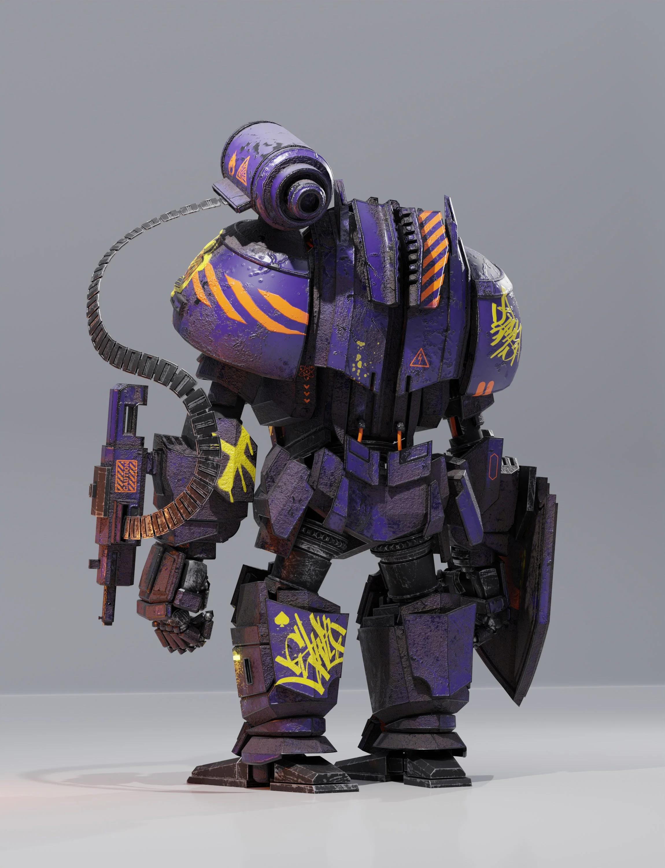 I was inspired by the idea of repurposed technology, which fits neatly with the cyberpunk aesthetic to imagine the ad-hoc repair and repurposing a decommissioned military robot.