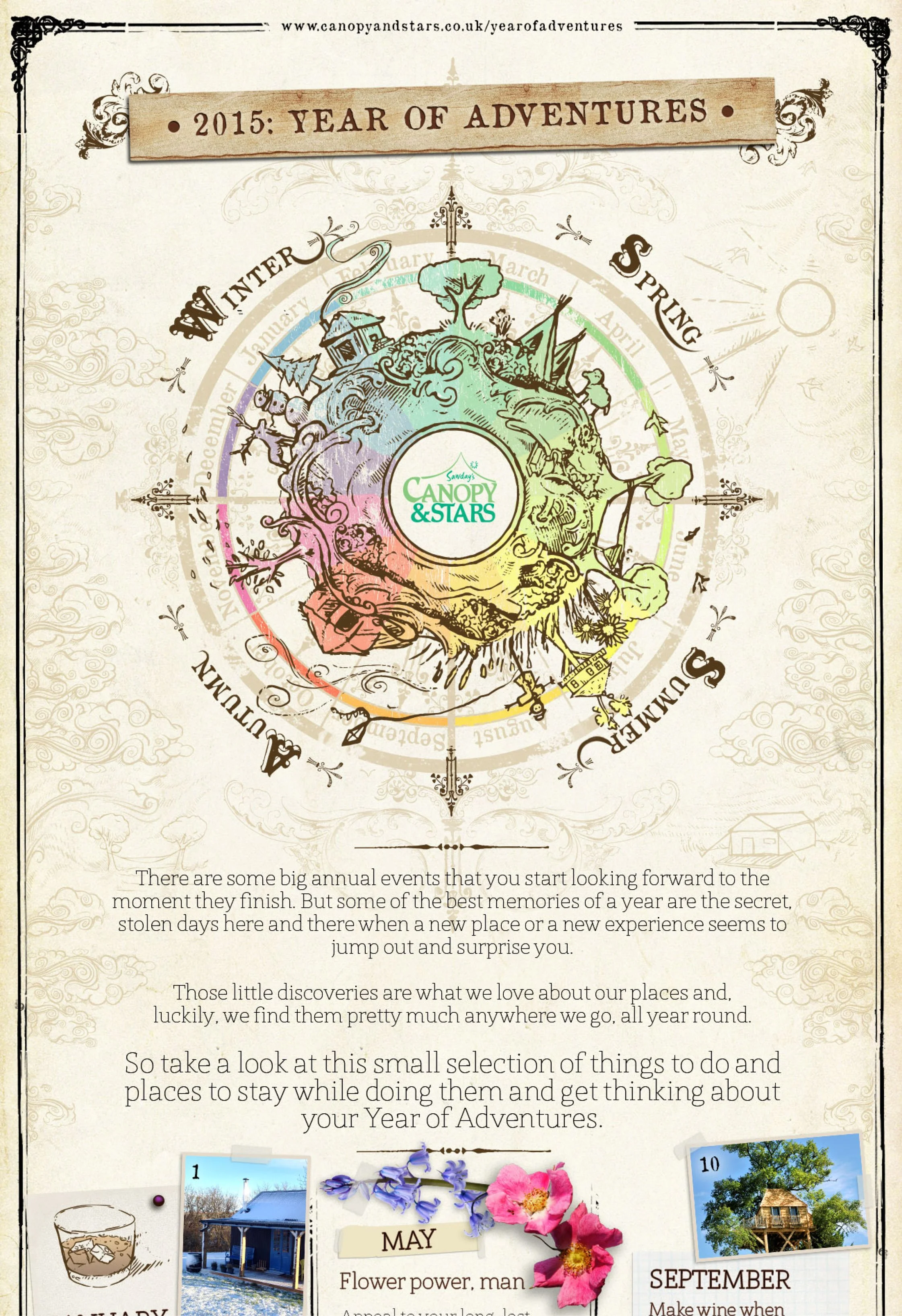 For the year of adventures project, I was asked to create an illustrated infographic. The idea behind the project was to give customers a taste of all the wonderful adventures they could enjoy throughout the year, with the intention of motivating people to book glamping locations throughout the autumn and winter months, when bookings were more sparse.