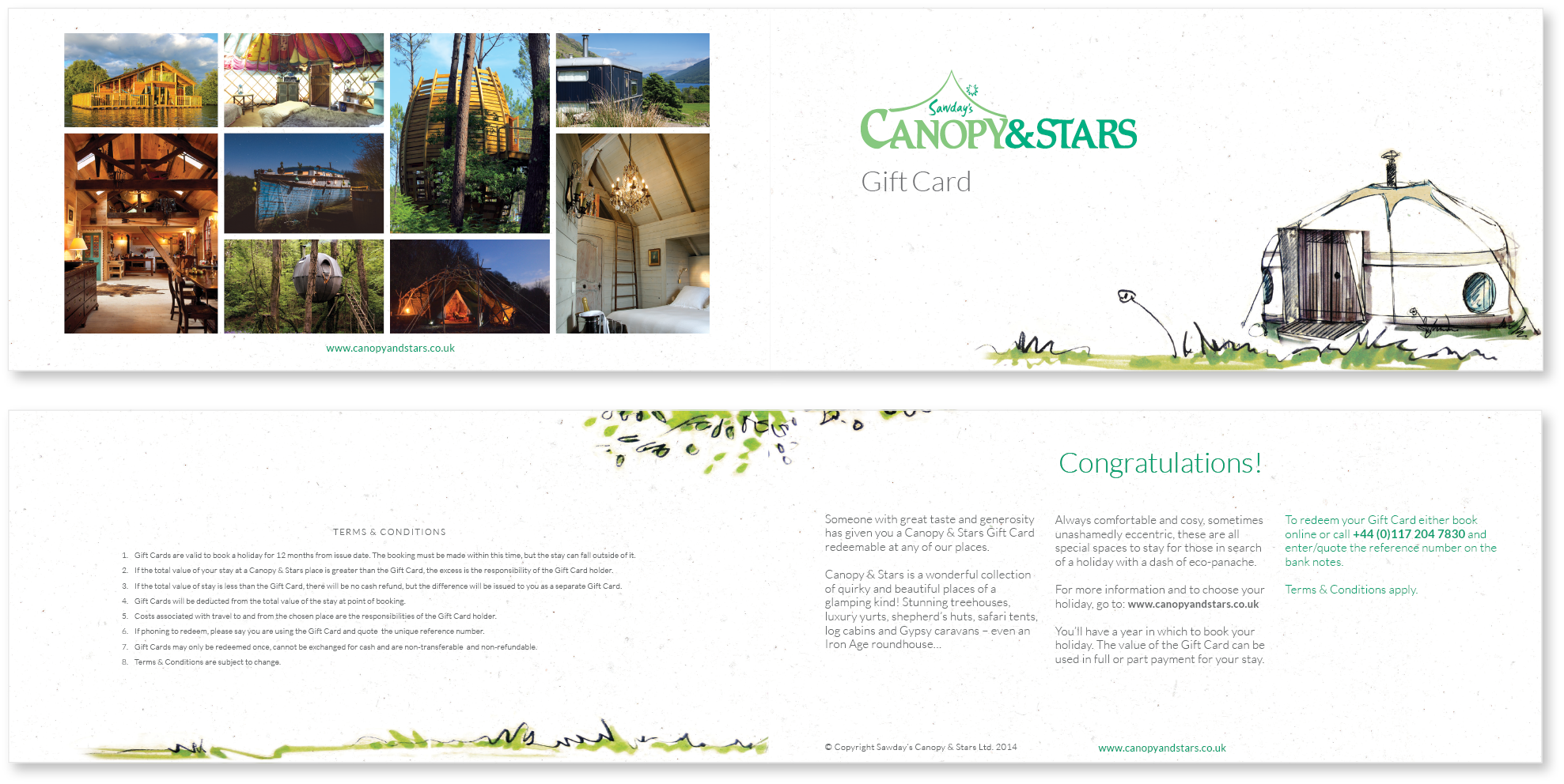 The Canopy & Stars gift voucher were overdue a refresh, so I was tasked with rejuvenating them in a way that fitted with the way the brand had evolved since they were created.